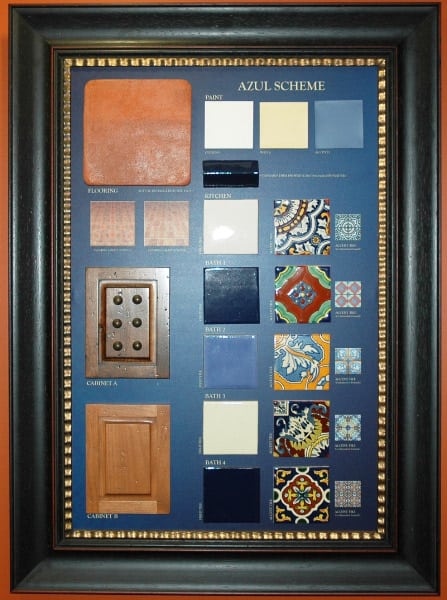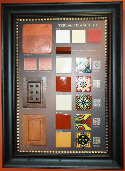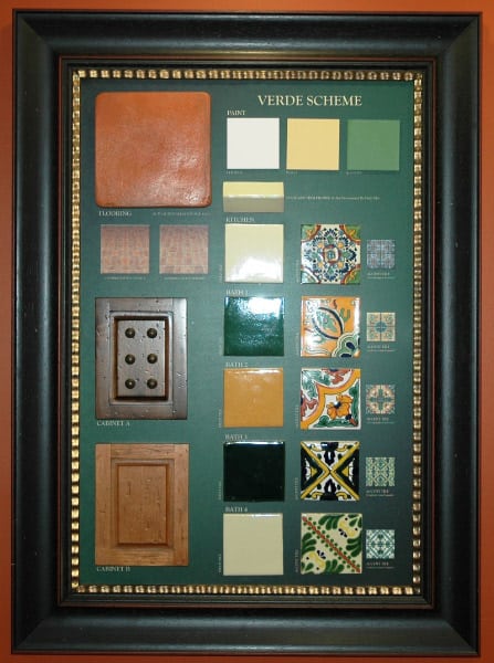 However, after seeing the color boards, my concerns have dissipated. I think the color boards look wonderful. Now the difficult decision of choosing which one. I like the warth and coziness of the terracotta scheme. I think the blue scheme may give a classic beachy, cool feel which on a hot day may be desired. The verde scheme may be nice as green is always a soothing color and in the middle of the desert, green of any kind is coveted.