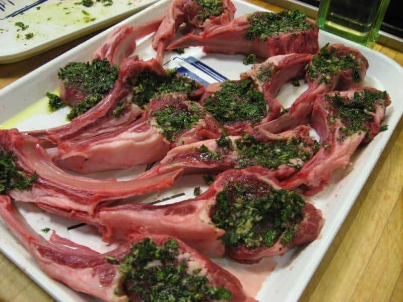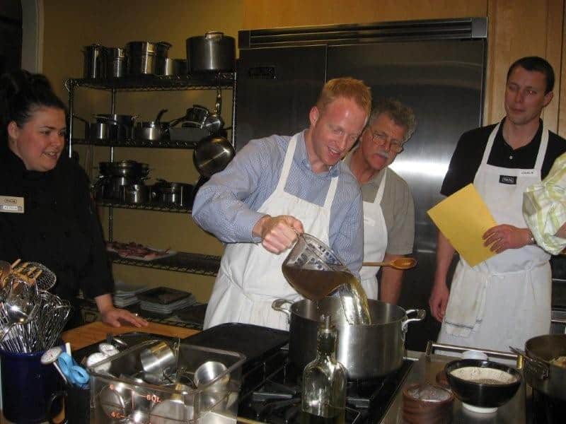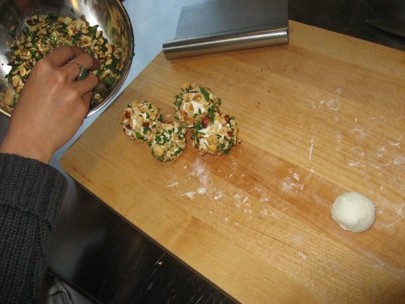 In three hours, we cooked up a storm. The menu for this class was definitely healthier and more delicious than the last class we took. Clint and I both agreed that our favorite dishes were the Lamb Chop “Lollipops” on Baby Spinach Salad and the Petite Cheese Course (Herb-Crusted Goat Cheese “Truffles”, Gorgonzola Dolce on Fig Cake and Neal’s Yard Aged Cheddar on Candied Apple Slices). I have had cheese courses at different restaurants but had never been crazy about them. This selection of the three types of cheese, fruit and nut combinations was incredibly good. Luckily there was only one truffle made per person or else I could have dangerously snuck a couple more of these.