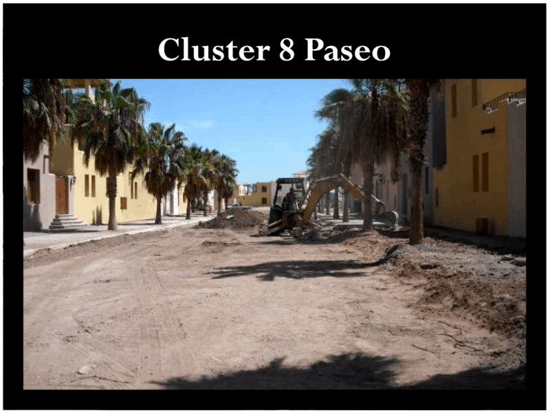 - Founders Neighborhood: The new design for the Paseo is nearing completion and work is now underway on Via Validad. The goal is to complete the Paseo from the Inn to the Posadas by January of 2009. We are pleased to share that work is now underway on the Cluster 9 pool and the hole has been dug. The stone walkways are proceeding quickly and the additional landscaping will start next week. Work also continues to progress in the courtyards as seen in the photographs below.