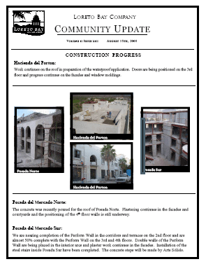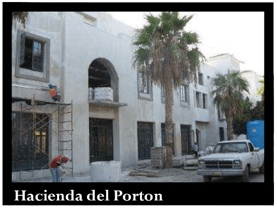 - Hacienda del Porton: Work continues on the roof in preparation of the waterproof application. Doors are being positioned on the 3rd floor and progress continues on the facades and window moldings.