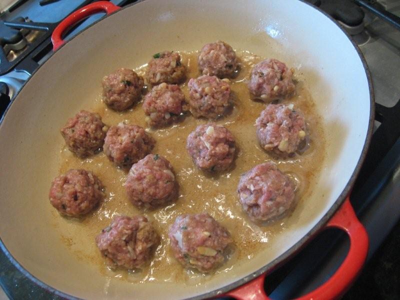 Meatballs in my Le Creuset. I still have not found a way to make my meatballs perfectly round, they get squashed in the pan. Is this possible with homemade meatballs or are the perfectly round ones made by commercial equipment?