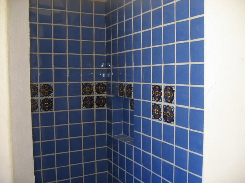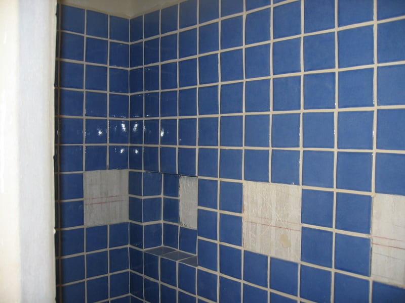 Another shower stall, this one with the accent tiles in place. You can also see the niche for soap and shampoo.
