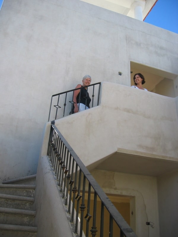 Nancy climbing up the stairs. Jane behind the camera. I like the iron railings!