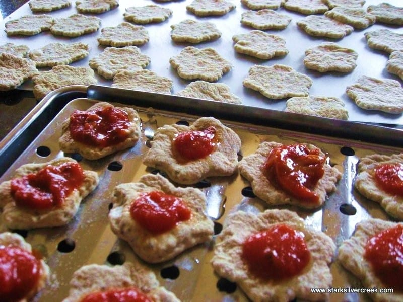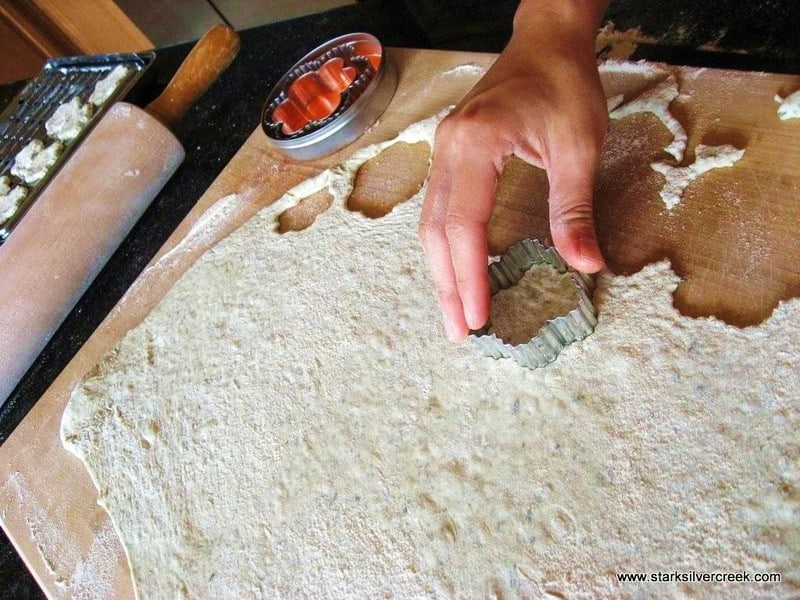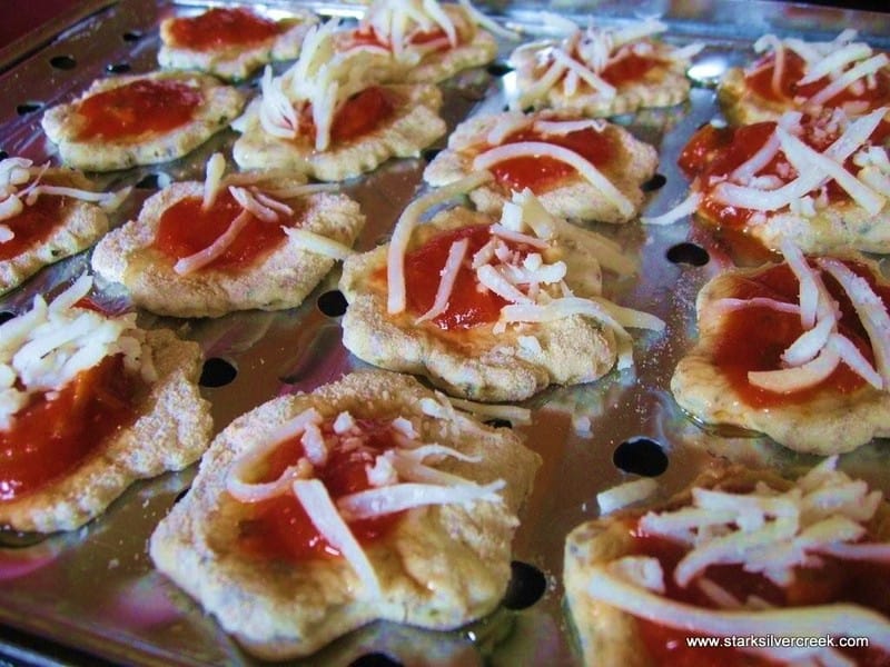 Rolled out herb infused pizza dough that came ready made from Trader Joe’s. I used a cookie cutter I usually use for shortbread during the winter holidays to make little pizza bites.