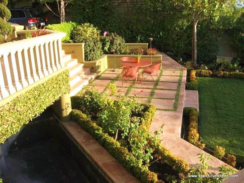 The backyard is on multiple levels. Standing at the stairs down to the lower level.