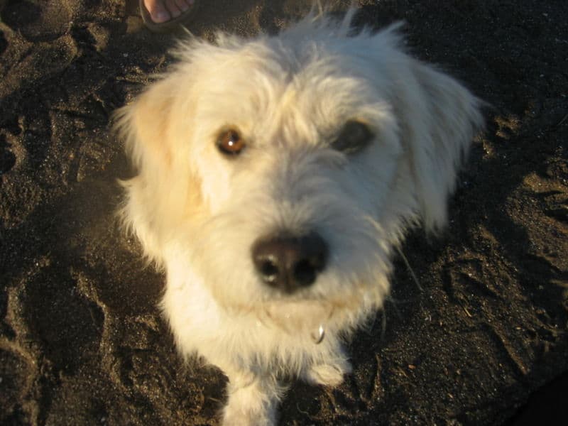 They came upon a small white dog, lying in the dirt, looking very frightened. Rich scooped him up in his arms and brought him home. He and his wife Jean, gave the unnamed dog a bath, hoping that they would be able to find him a home.