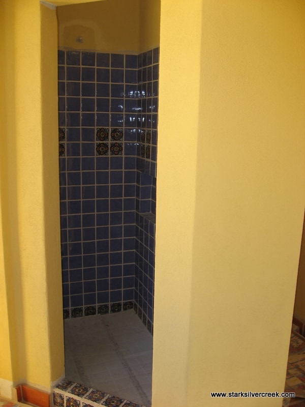 The shower blue and decorative tiles are all in place now.
