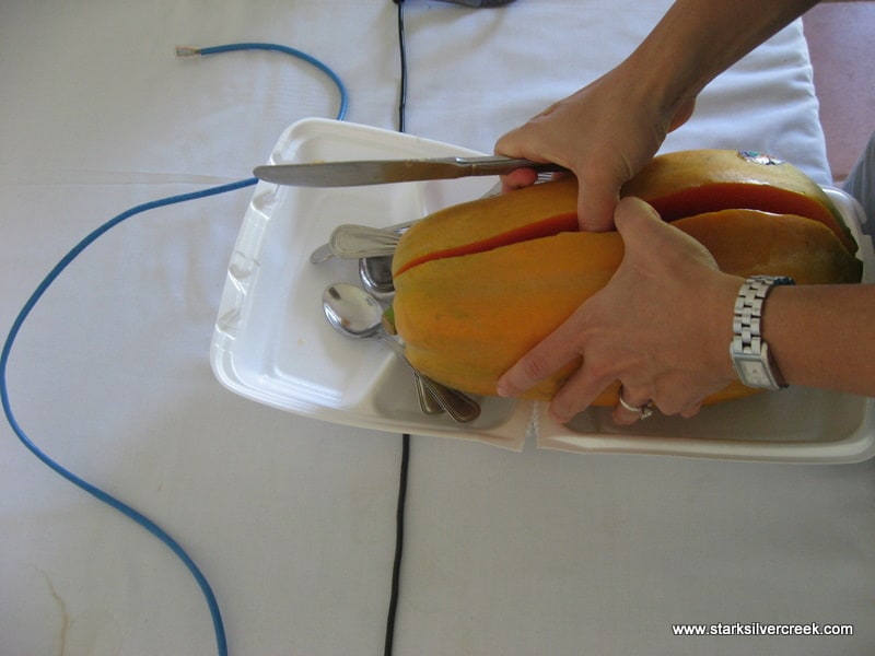 Then, I spotted it and simultaneously decided I had to have it. A crate of beautiful, smooth, sunny orange papayas. I selected one and handed it over to Clint who cradled it like a football. I knew when I got back to the hotel, I would borrow some utensils from the hotel restaurant, cut it open and scoop out the delicate, meaty flesh for a refreshing brunch.