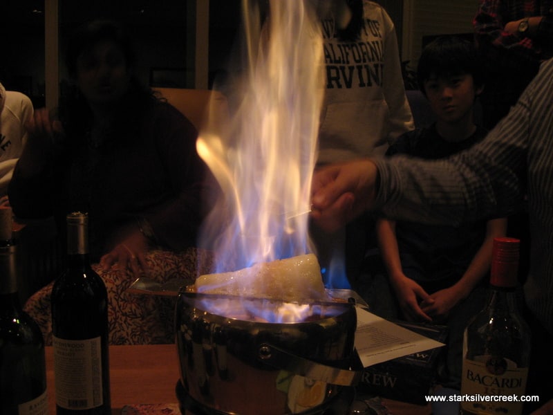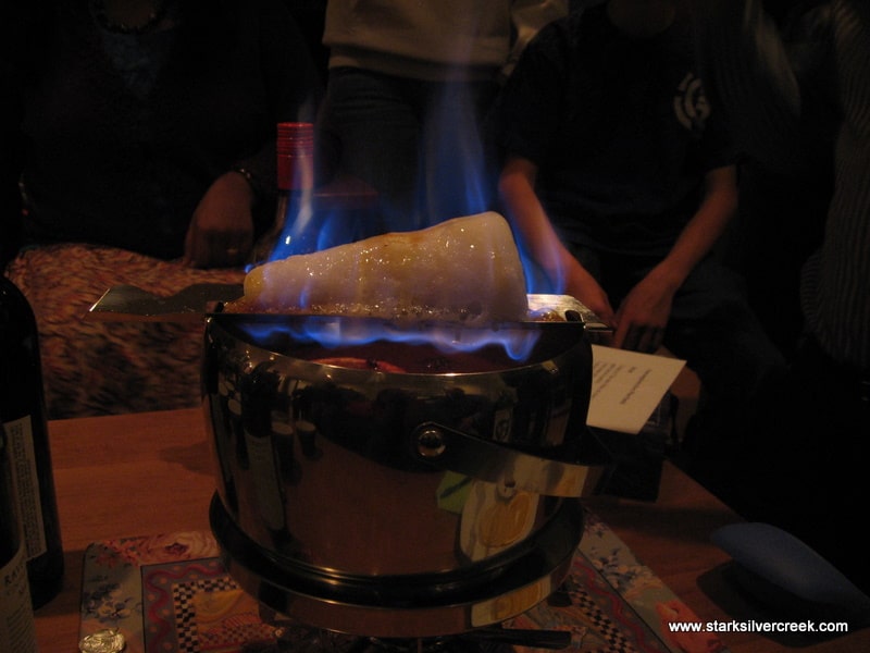 A fiery finale… There are very few things more exciting than fire and for the evening, the finale was the Feuerzangebowle…a long, long German word which translates into “Fiery Wine Punch”. The key ingredient was a compressed cone of sugar and Barcardi 151 Proof rum. You put the other ingredients (3 bottles of fruity red wine, 2 cups of orange juice, 1/2 cup lemon juice, 3 cinnamon sticks, 1 sliced orange, 1 sliced lemon, 10 cloves) into a fondue-like pot. Suspend the sugar cone on top of the bowl, pour some of the rum on it and light it on fire.
