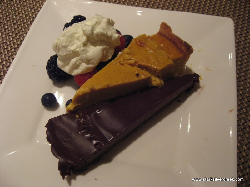 Pumpkin pie (I brought this over, it is the true Paula Deen recipe – not my modified version), chocolate torte, berries with whipped cream. Can you really desire for anything else?
