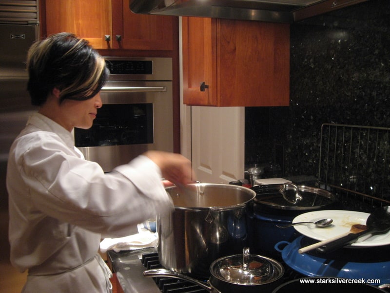 Susan O, the chef, prepares delicious goodies on the gas range.