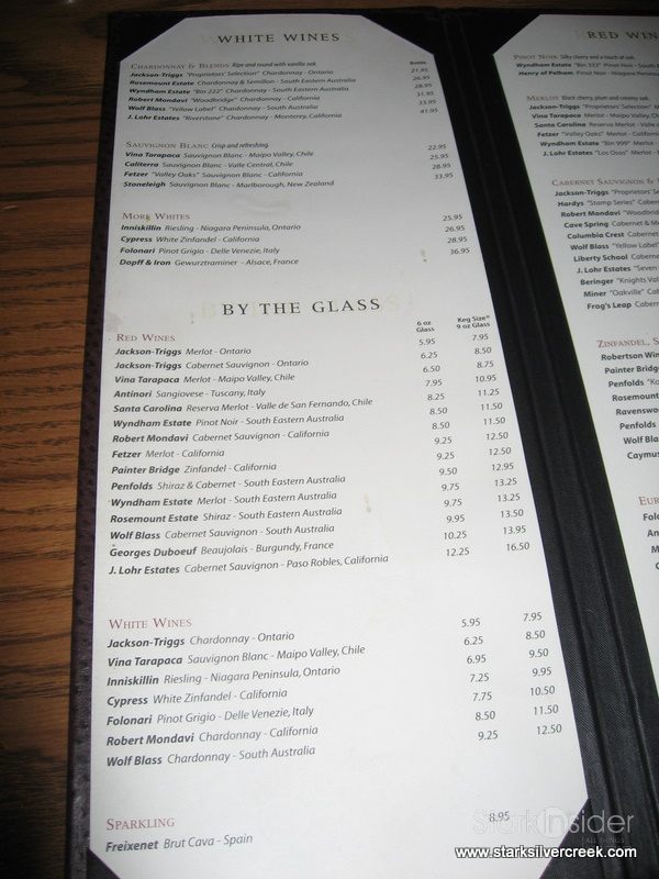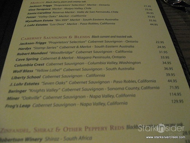 The wine selection at The Keg is decent by Canadian standards, okay by California standards. There was a nice variety of wines by the glass. One thing I did find strange was that the vintage of the wines were not listed on the wine menu and I had to ask our waitress. All the wines were quite young so perhaps it was not as relevant.