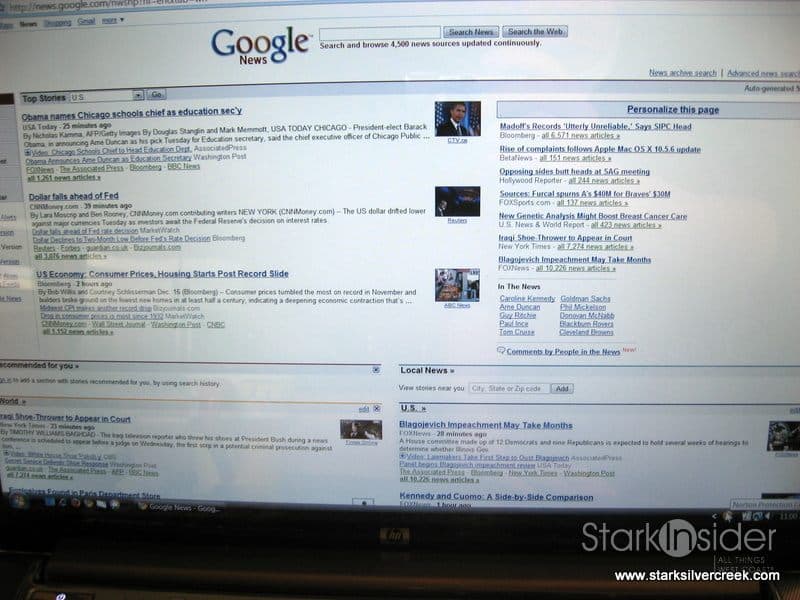 The other thing I noticed with this widescreen display is how much extra unused room there is to the left and right of most web sites. It’s unnoticeable on older non-widescreen displays. But with this HP surfing many sites was like watching a letterbox movie, only with the bars on the right and left. The benefit of course is space. I could easily have two windows lined up side-by-side, convenient for running Microsoft Word and Firefox, for example, at the same time without window flipping.