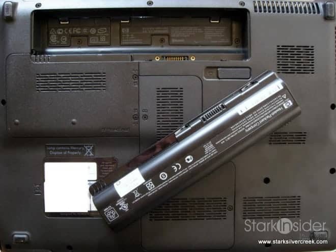 I ordered a “high capacity” upgraded battery. It’s still a 6-cell, but with apparently more umph. I like the way the batter locks in the bottom of the unit, and does not just out at all. It sits flush with the case. Running the dv5t on standard brightness with wireless switched on I got about 2 hours of running time, before Windows began to warn me. That seems ok to me, not great but good enough considering the size of the display.