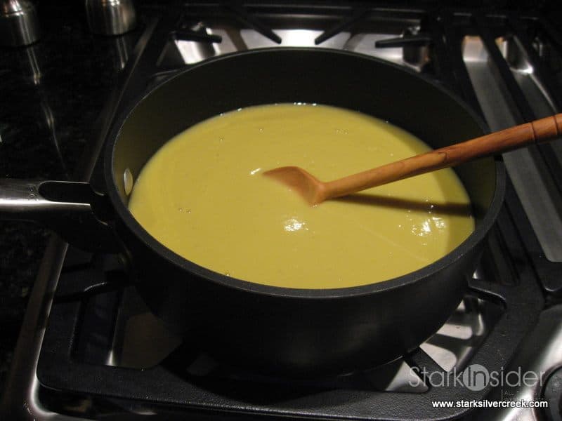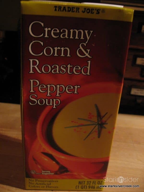 Pour the entire package of Trader Joe’s Creamy Corn & Pepper Soup into a heavy pot. Add frozen peas and any other “options” ingredients into the pot.