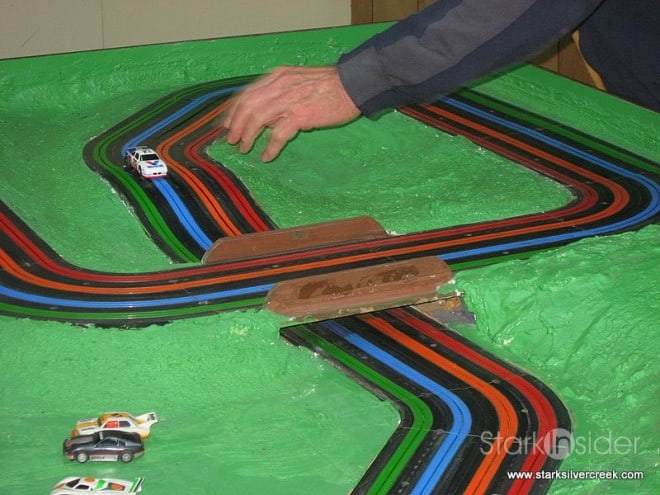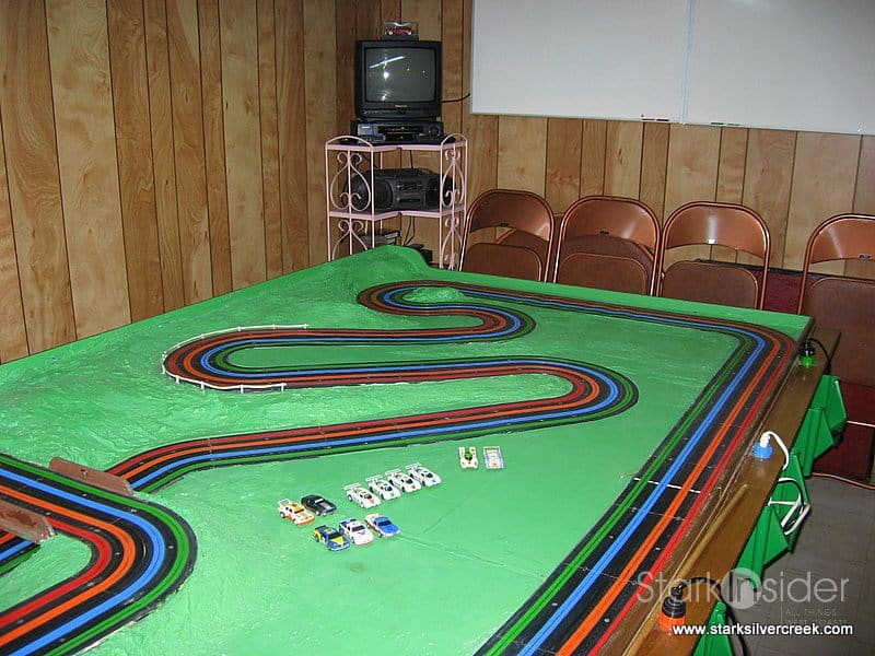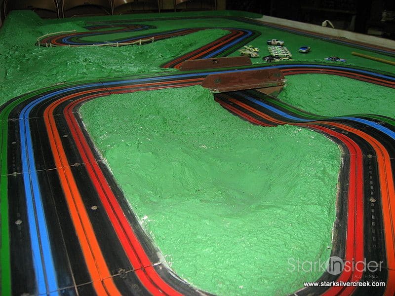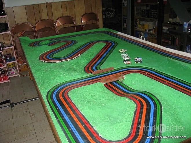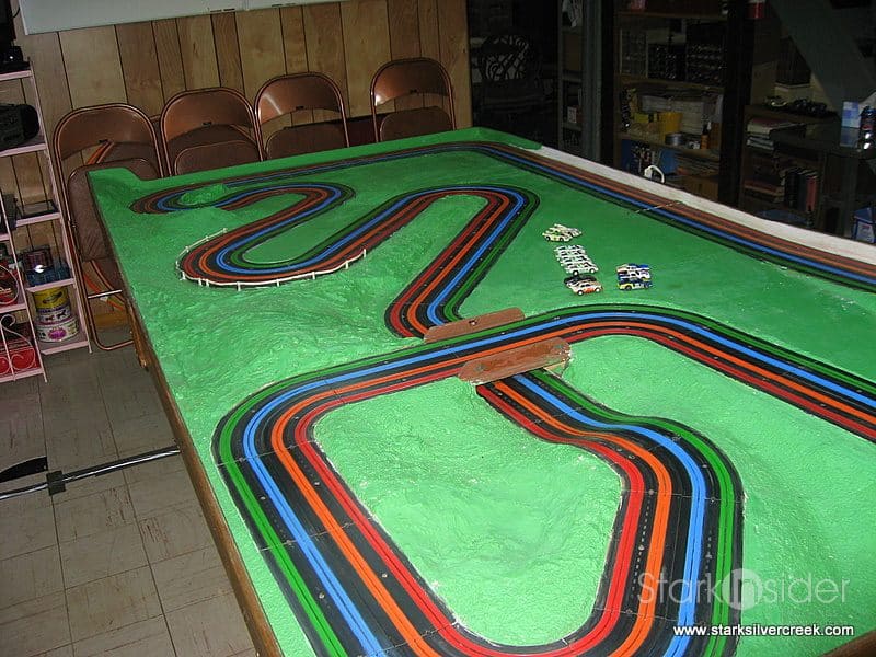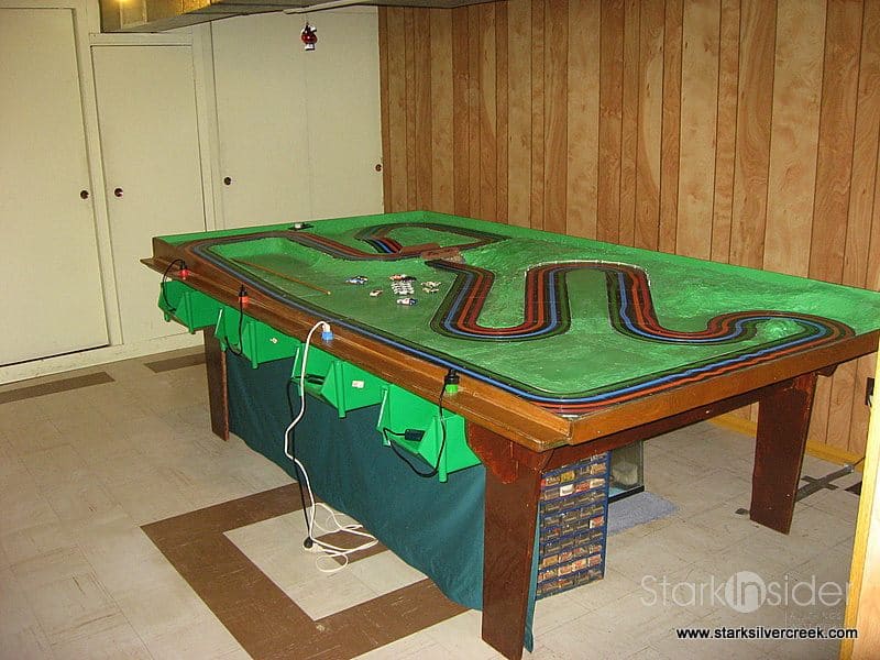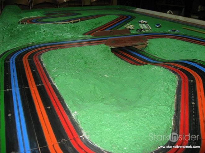(UPDATE: There is also a video of this slot car track in action here… hours and hours of fun!)