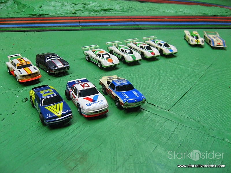 The track is 4 lanes, each with an individual controller. The cars are HO scale, and over the years the collection has grown to over a hundred different types from manufacturers such as Aurora AFX, Tyco and Life-Like.