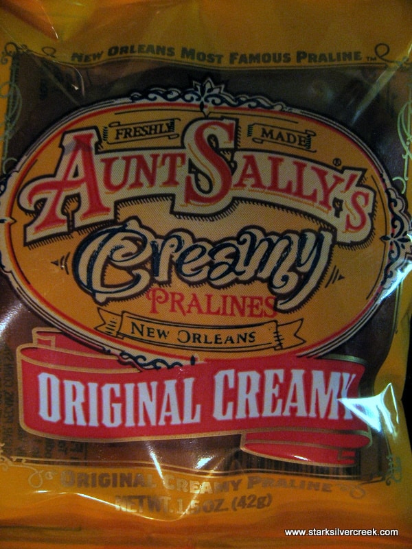 I peered in and found some blood oranges from her garden and a couple of shiny orange packets with the words, “Aunt Sally’s Creamy Pralines”. Susan smiles and commented she had a story to tell me later.