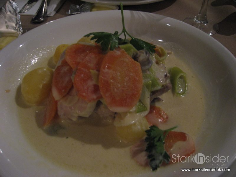The meal was not innovative, nor was it comfort food. It arrived in an bowl with unimaginative ingredients such as carrots, potatoes and what could have been a can of Campbell cream soup reduced to a thicker sauce (the latter coming from someone who has pulled this trick in the past). Nor was this dish a classic, comfort food as certain parts of the chicken was a little too dry and overall, very bland by both Vivek and my verdict. Paige’s main course looked unappetizing from the get go.