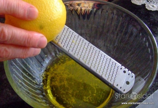 Simply combine 1 table spoon of the olive oil, lemon juice and grate in the lemon zest.