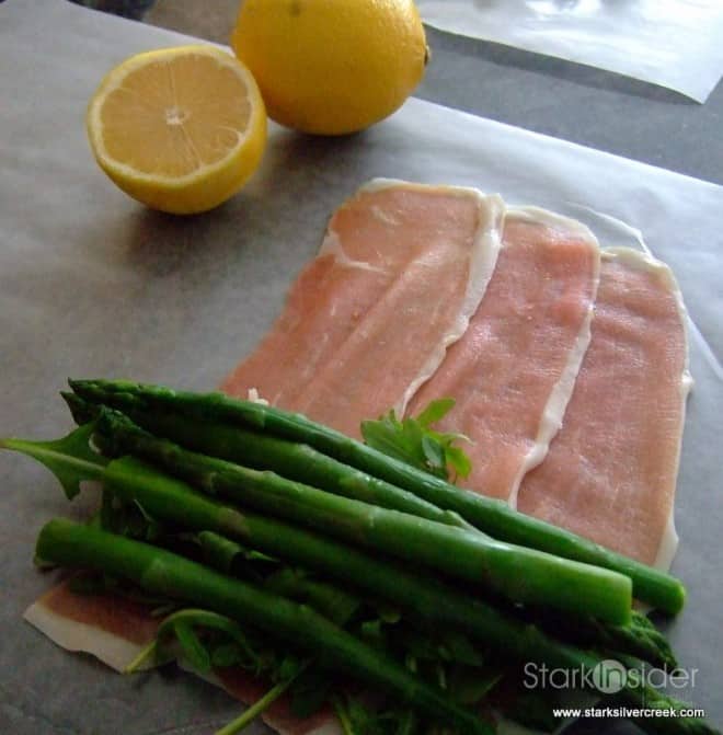 This is a fantastic recipe to dress up a simple dish so that it can be served as dainty hors d’œuvre at a party. I made something similar at a Viking Cooking Class, however, the final form factor was simply spears of asparagus wrapped in prosciutto which works well as a side dish to a sit-down meal, but not while trying to navigate a room full of people.
