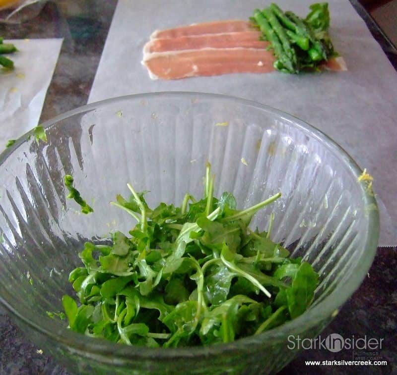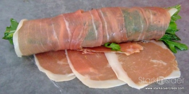 Roll the prosciutto around the asparagus, arugula and goat cheese as tightly as you can. (If you don’t, there is a greater chance the little sushi roll will fall apart before it reaches your guests’ mouths. This is a predicament you should try to avoid.)