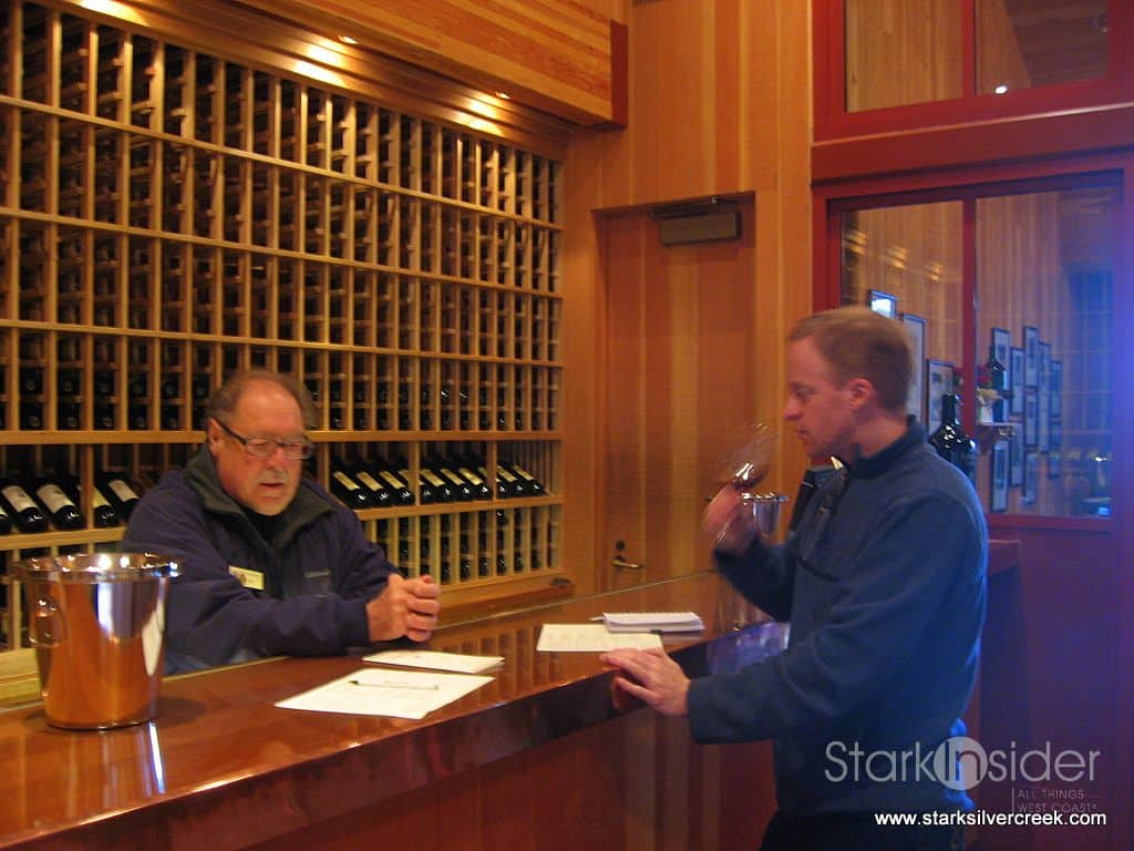 Finally, upon returning to the smaller tasting room, we were led by a very nice man into an enclosed tasting room encased in cedar and glass. Clint thought it was like being in fish bowl. I thoroughly enjoyed being in the enclosed tasting room. Once the door behind us shut, the room was nice and quiet, a most welcome contrast to the bustle outside.