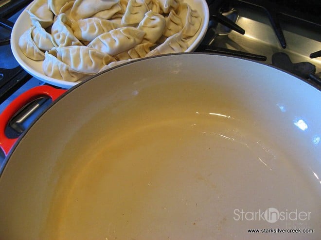 4. In a large pan, heat up 3 tablespoons of canola oil at medium heat and gently place the dumplings into pan. Don’t crowd the pan, if you need to, cook them in batches. Cover pan and cook for 2 minutes. Add 2 tablespoons water and cover pan again. Cook for another 4 minutes or until the center is cooked.