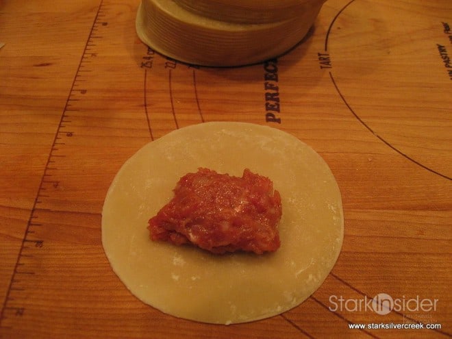 3. Place a small portion of the filling mixture at the center of a circular gyoza wrapper. Dip a finger in water and spread the water around the edges of the wrapper. Fold the wrapper over the filling and close by creating pleats as shown in the photos.