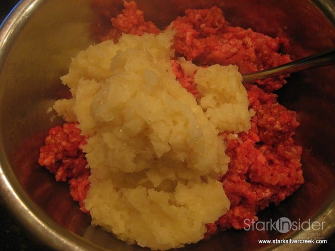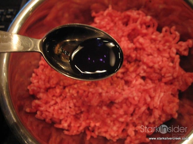 2. In a large bowl, add the ground beef, soy sauce, sesame oil and rice wine vinegar. Mix thoroughly. Then add the onion/garlic mixture and mix throughly again.