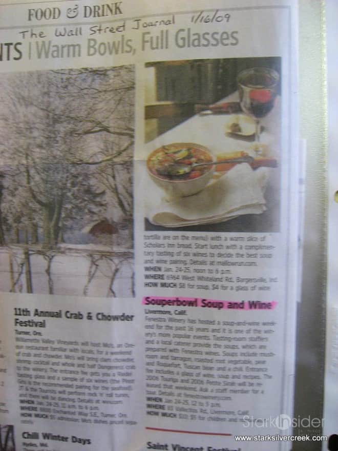Last weekend, Clint and I attended Fenestra’s SouPerBowl event in Livermore, CA which was a unique event where wines were paired with soup. When we arrived, the place was packed. Fortunately for me, Jay and Judy spotted me as I was purchasing the tickets at the front ($10/person, $5 for children and non-drinkers)