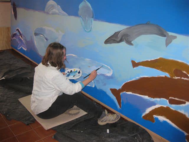 All the way from Maine, artist Carla Sanders has been diligently working on a large painted mural to be placed in the new visitor center for Grupo Ecologista Antares, the ecology organization that helped create the Bay of Loreto National Marine Park. Carla even extended her trip to ensure she could fully experience Loreto, the whales, and the process of her creation. I first discovered Carla on the web late January and heard about her trip to donate her time and talent, and haul art supplies to Loreto. Having never been to Baja or Loreto, Carla felt called to come and it happened serendipitously through Colin Garland of Global Classroom and Fernando Arcas of GEA. You can learn more about GEA here: