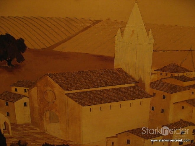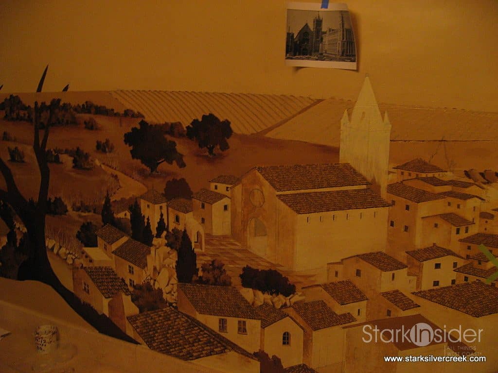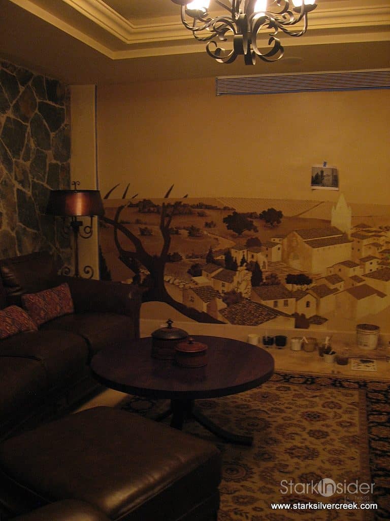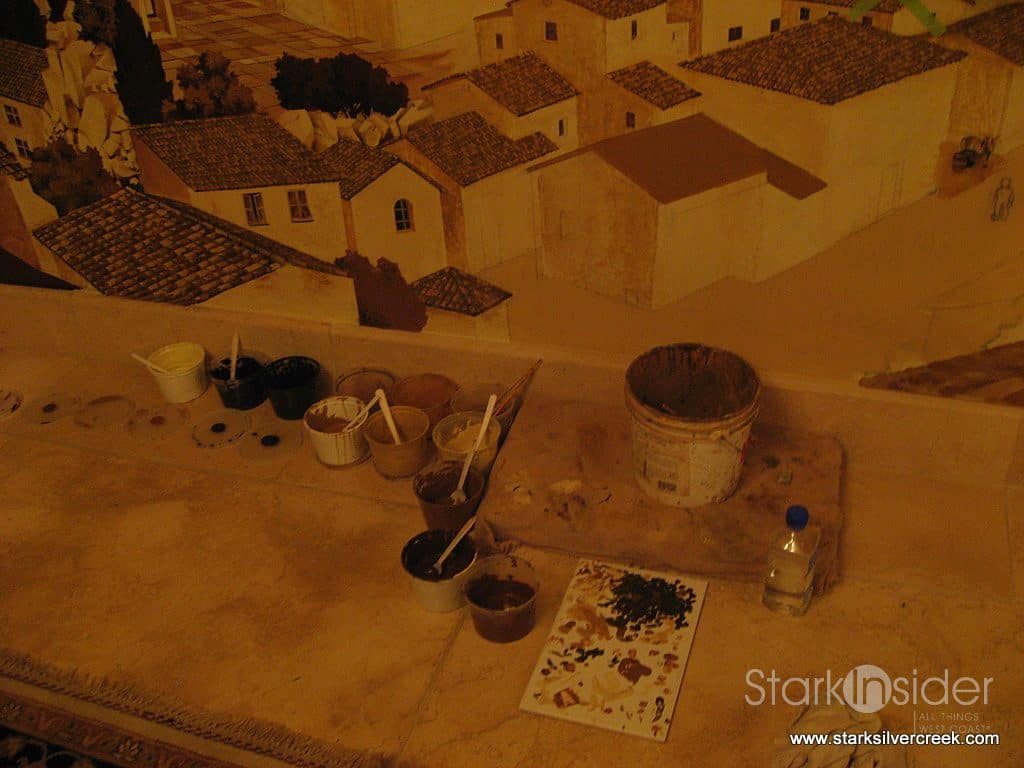 Murals adorn several of the walls on the inside and outside of the hotel. I was fortunate to catch a mural that was still being painted. The artist had left for the day but the pots of paint in muted browns, blacks and whites were on the floor along with a photocopy of the inspiration for the mural.
