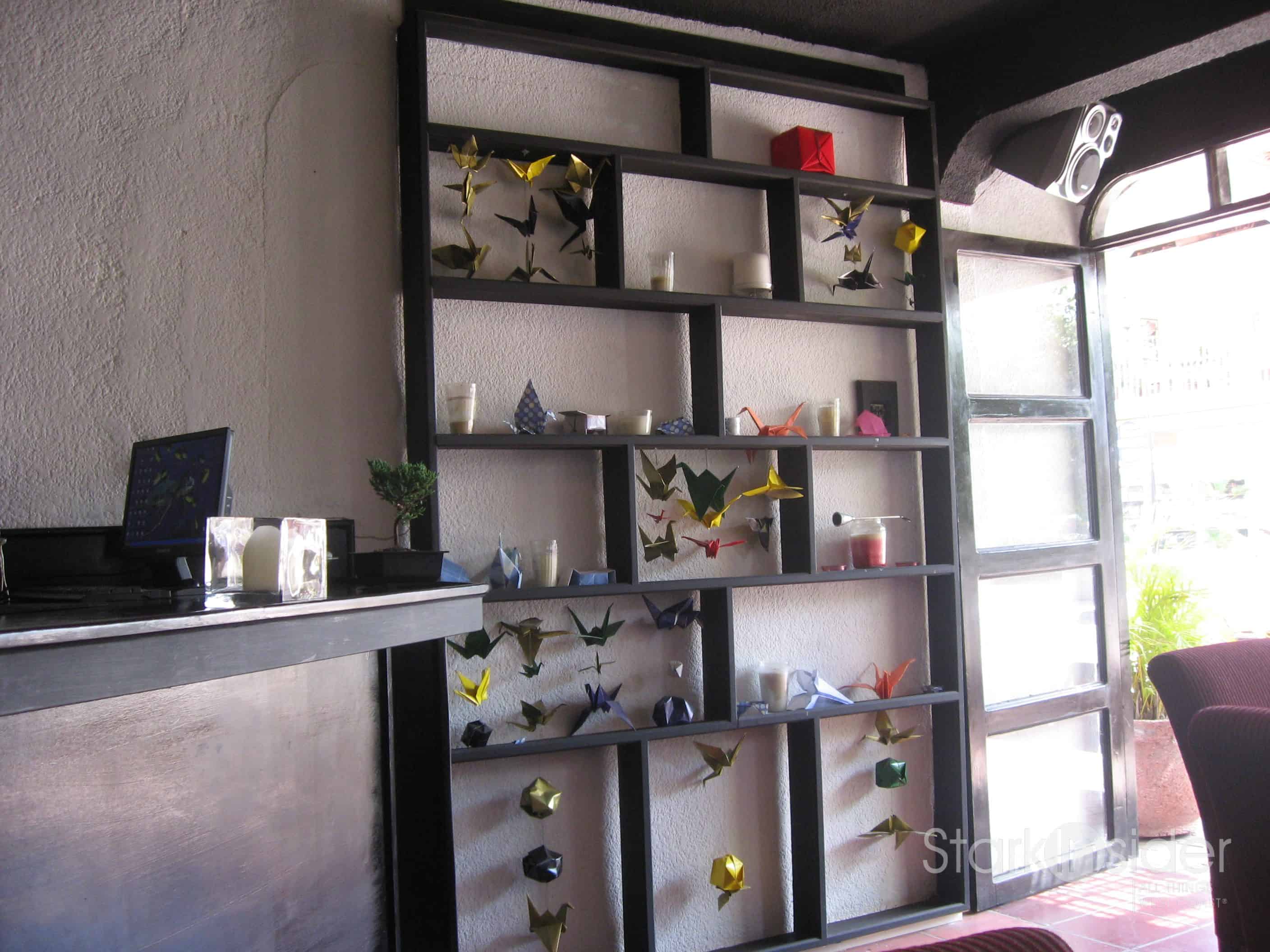 When we returned, the chairs had been arranged and we were seated against a wall, across from the bar area. On the same wall as the bar is a simple shelving system adorn with little origami creations, all average-looking. The gentleman who we had seen before was named “Pierre” and was the proprietor of this restaurant as well as a couple of others in Loreto.