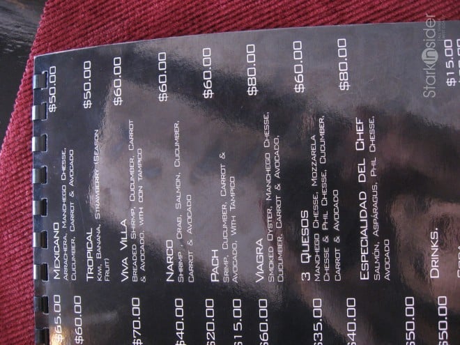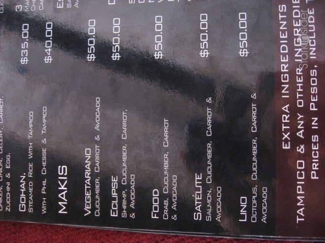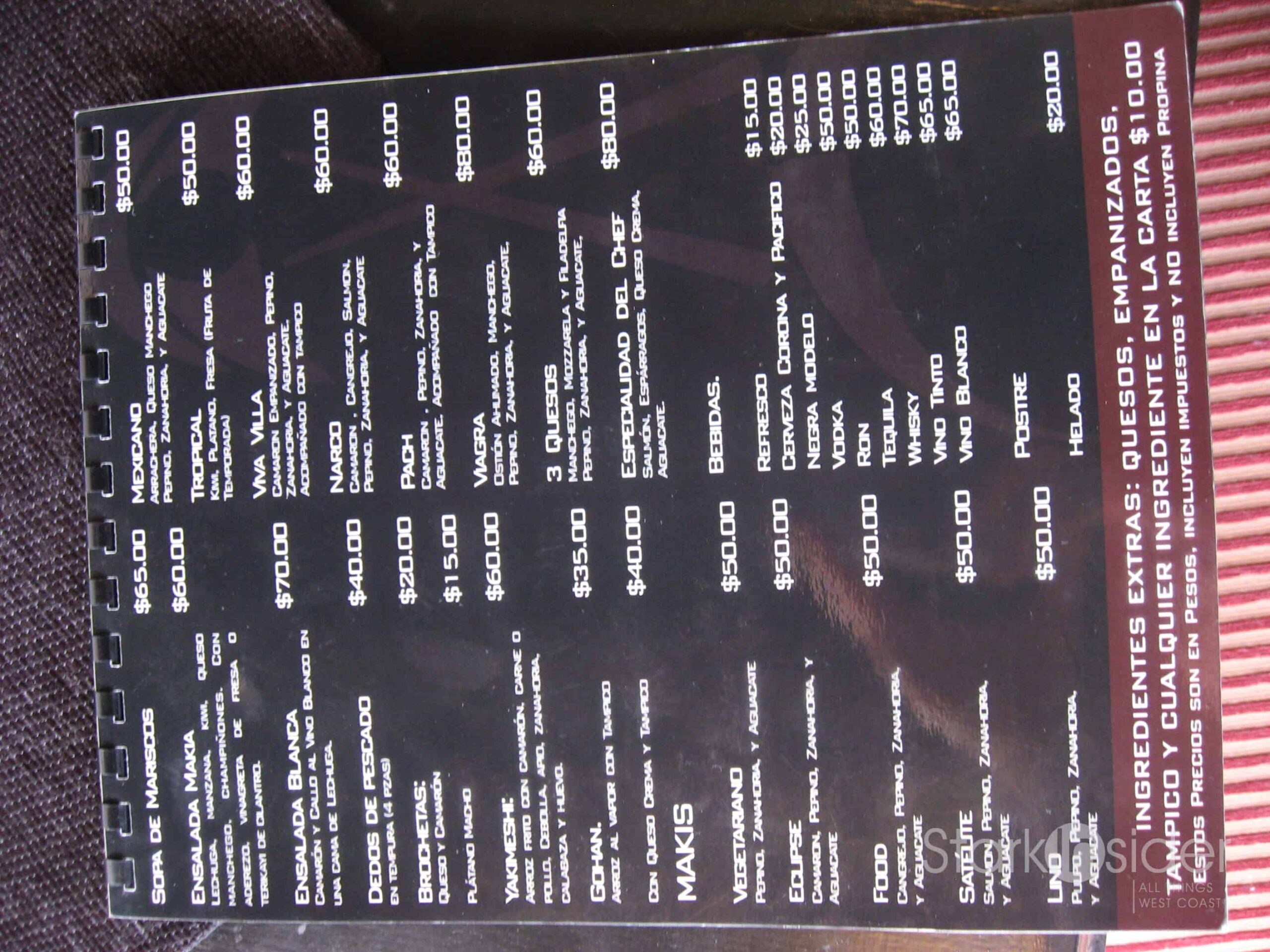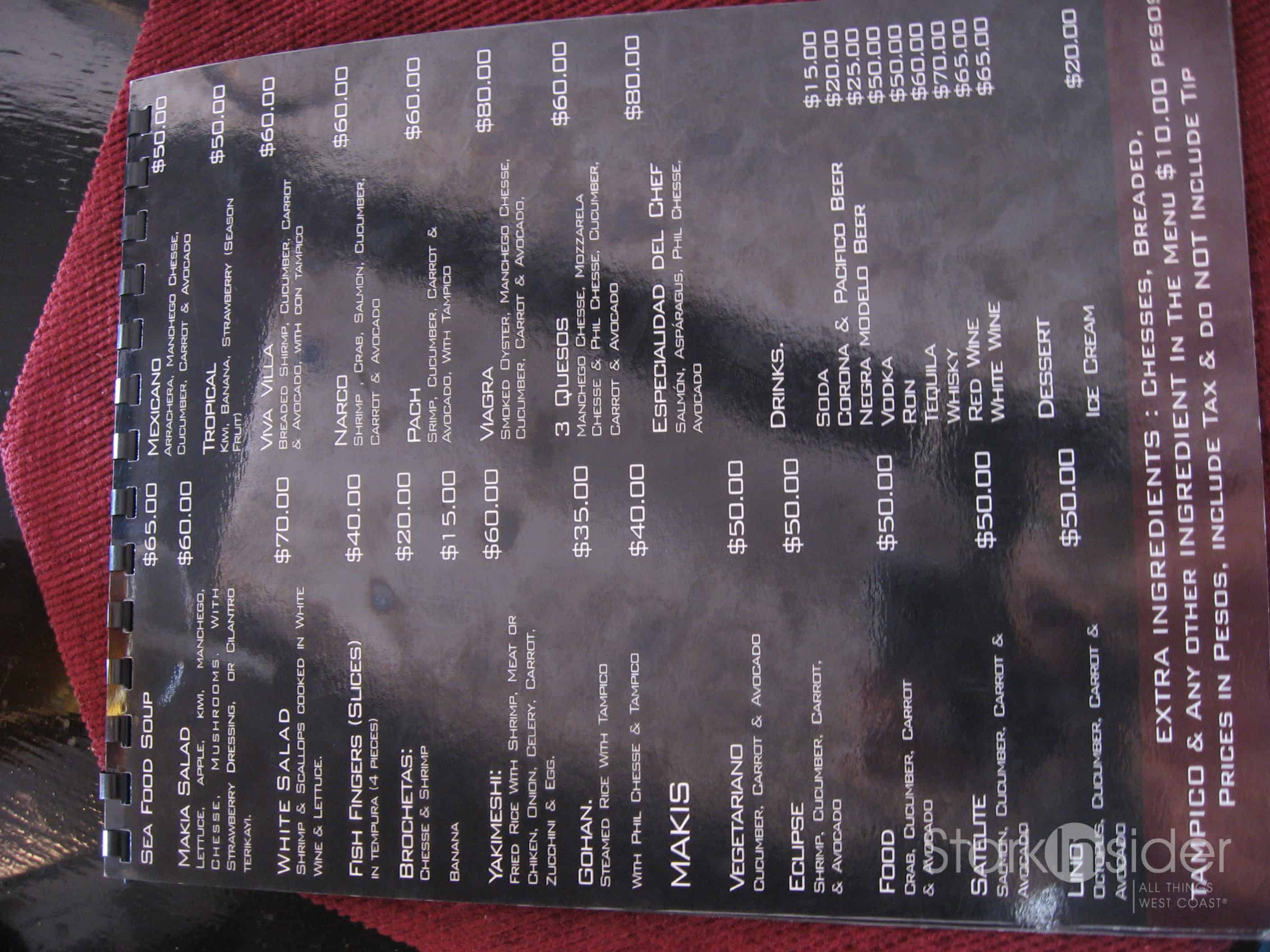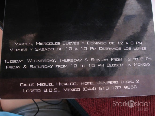 I first reviewed the menu which continues the black and white color scheme of the restaurant. I noticed there were no selections of nigiri sushi or sashimi which is disappointing considering the close proximity of Loreto to the Sea of Cortez.
