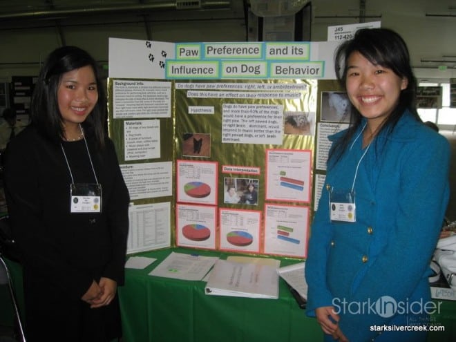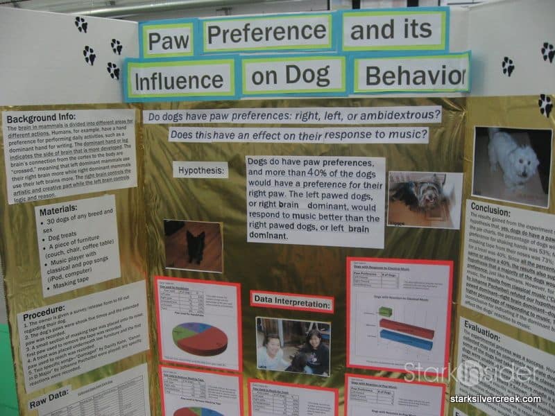 Dog lovers will enjoy this one. This project proved that, like humans, dogs generally have a right-pawed tendency. Using 30 dogs and three tests (hand shake, tape and treat) they could determine that dogs tended to use their right paws. Then they tested right brain/left brain behavior in relation to music (pop and classical). The results could then be used to determine which dogs would be best suited for rescue work for example.