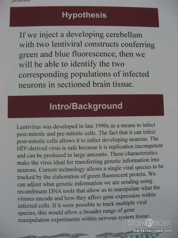 I had some difficulty with the title. Not the project itself, rather my inability to properly say ‘cerebellum’. By the end of the day though I could whip it off with ease! This is a difficult project to explain. It involved color-coding plasmids so that multiple viruses can be injected in an experiment. The work itself was conducted in a Stanford lab with a mentor.