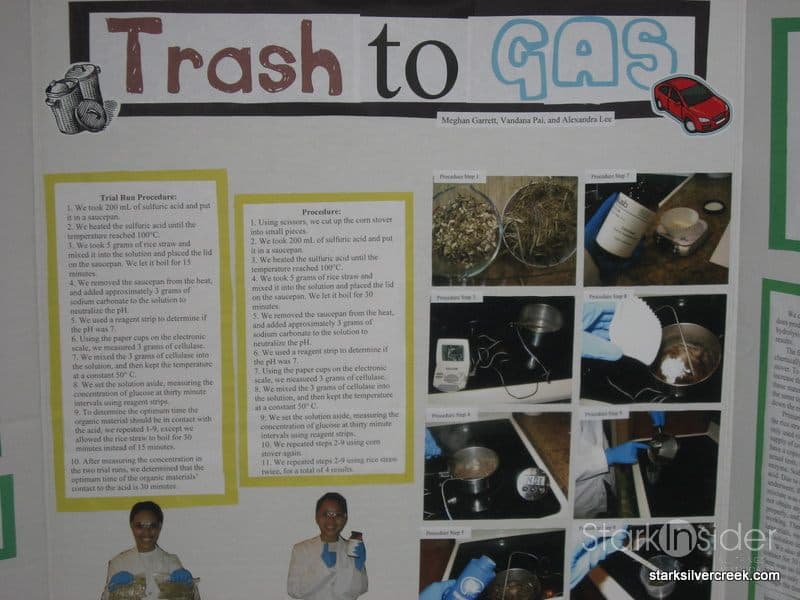 This was a timely presentation indeed. The team wanted to find out which yielded better results (in the form of glucose) for ethanol as an alternative fuel: rice straw or corn stover. The conclusion matched the hypothesis. Rice straw produced greater quantities. Unfortunately, as they demonstrated in their exhibit, the price of large scale production is still prohibitive. Although Brazil is innovating successfully in this area.