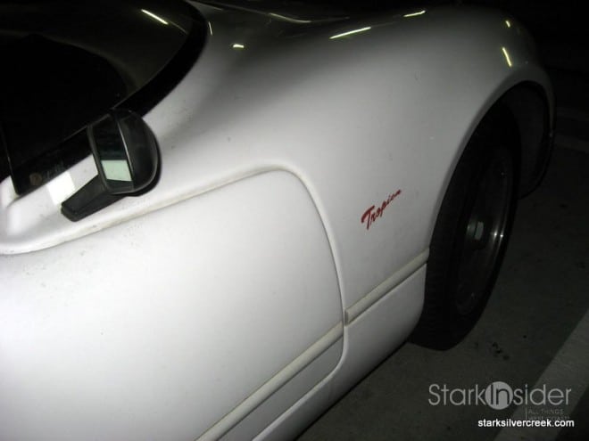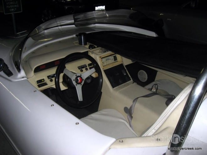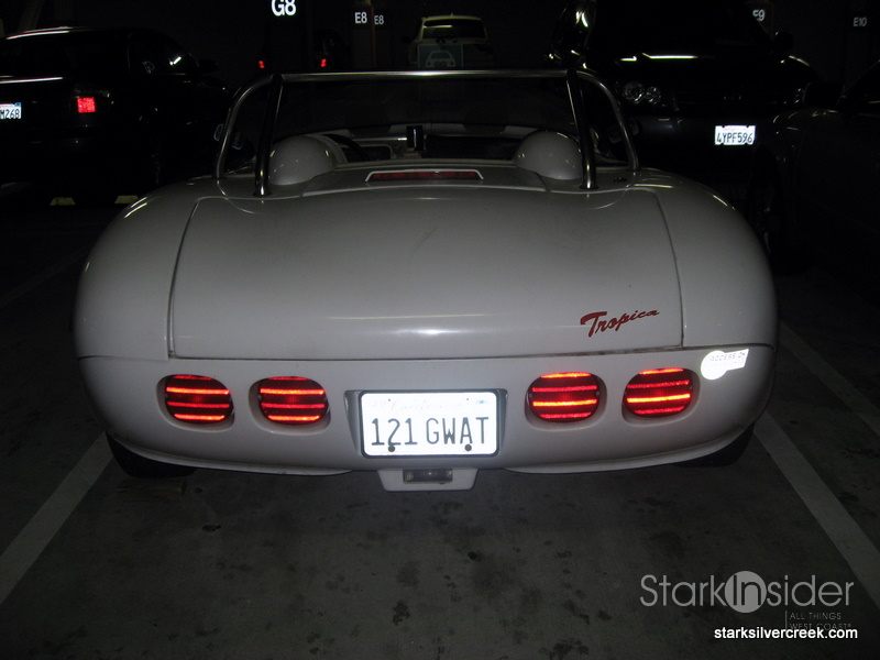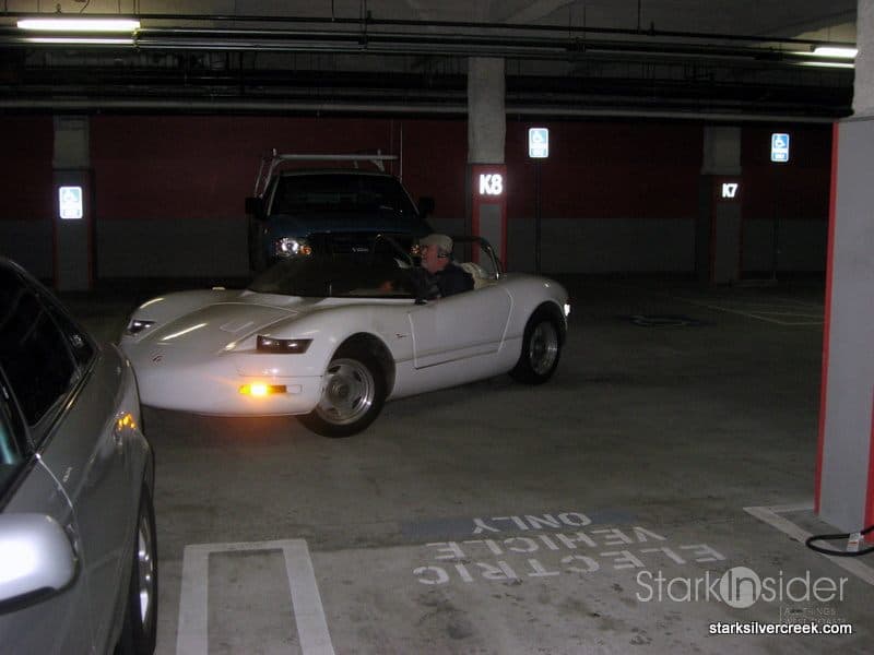 Being a car lover, of course I just had to park next to it. It looked like a Maclaren with a dash of ’62 Corvette and Jimmy Dean Porsche roadster mashed together. Curiously I noticed it was plugged in to an electric charger on an adjacent column in the garage. Ah, an electric sports car!