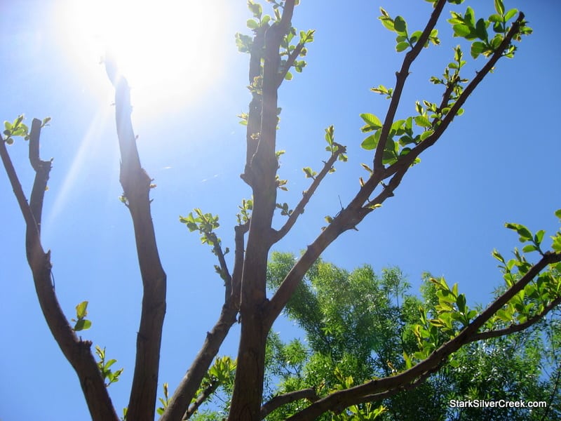 Thank you all for such an emotional outpouring of support for the concern over our severely pruned tree out front. It’s nice that you care. I just thought you’d like to know — perhaps it will make your day better and you can live on without anguish — that the Tim Burton tree lives. The very next day after I lamented that it was near death, it sprung to life, spurred by this ridiculous California heat wave!