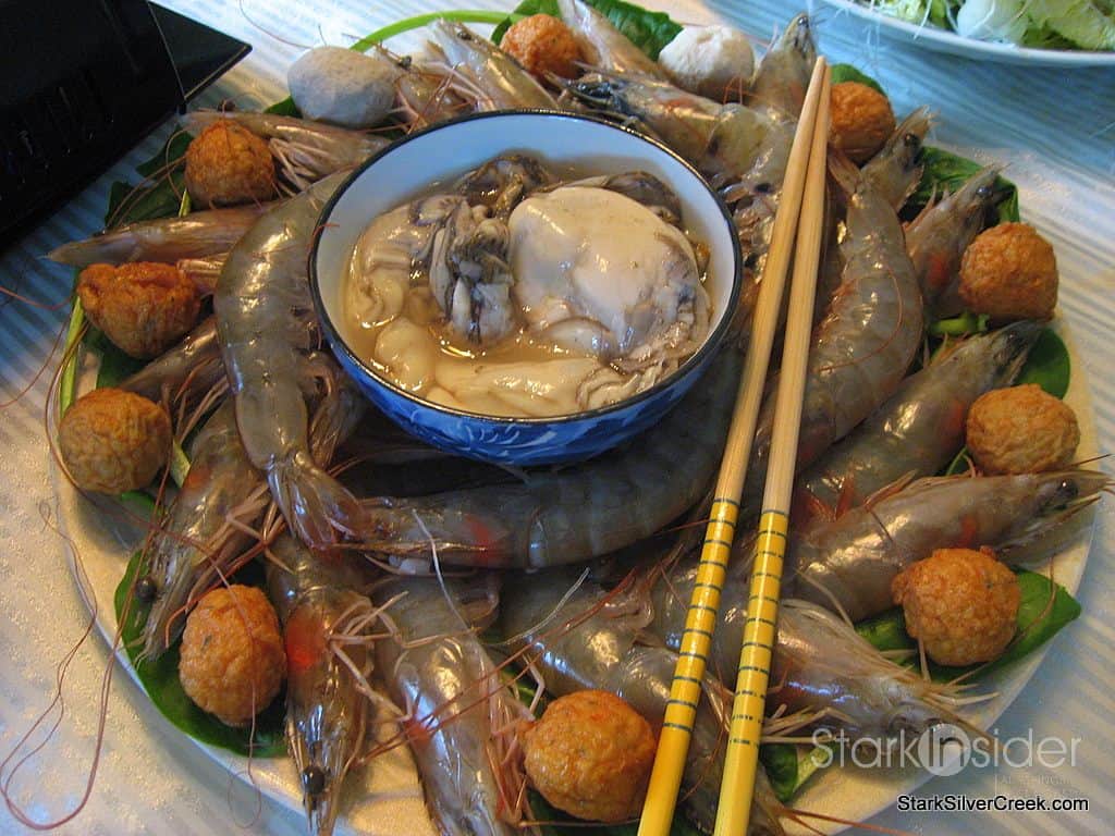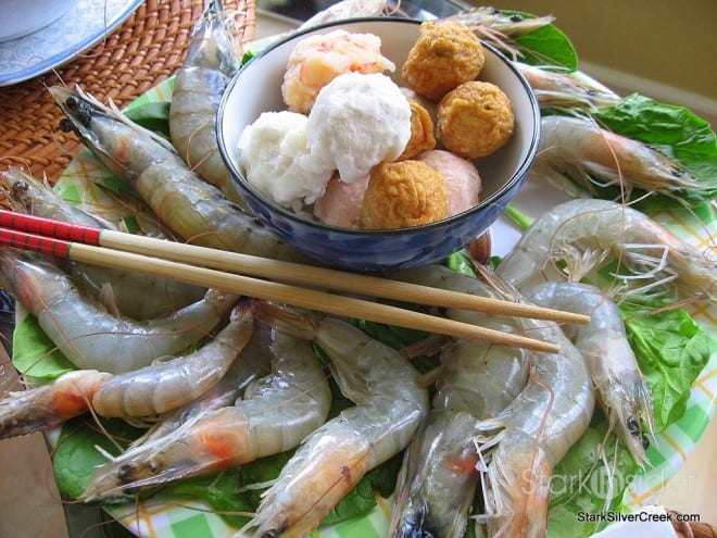 The spread included three different types of noodles, slices of different meats, prawns, oysters, mushrooms, leafy greens, calamari and fish balls. All nicely laid out on plates. There were two pots of chicken broth that were steaming hot.