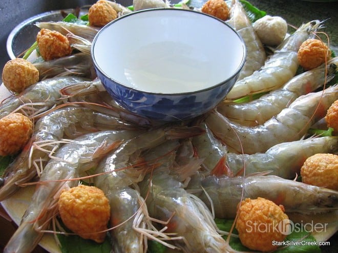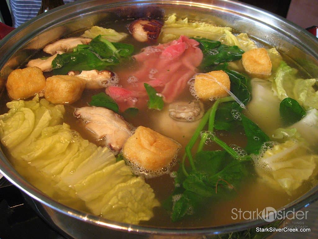 Then you grab whatever ingredients you want and place them into the hot pots. When they are cooked, you fish them out with a small strainer. There is an art to this as you want to put the ingredients that take the longest to cook in first such as the cabbage an then place ingredients such as prawns and oysters in last.