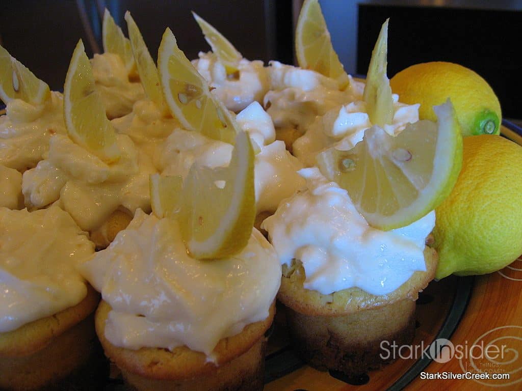 The onslaught of lemons from our prolific lemon trees, gave me great motivation a couple of weeks back to create a recipe that would use up some of those lemons for the dinner party at Debbie and Dom’s place. Because it was my attempt to turn my thoughts of lemons into dreams rather than a nightmare, I call these my “I dream of lemons” Lemon Dream Cupcakes.