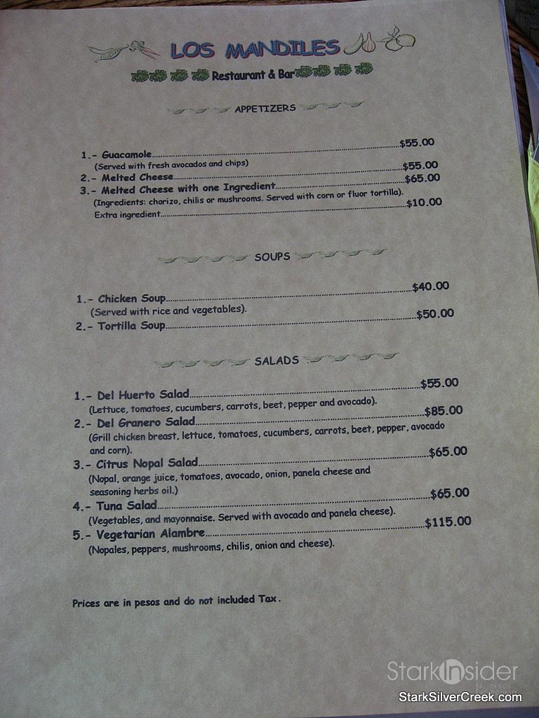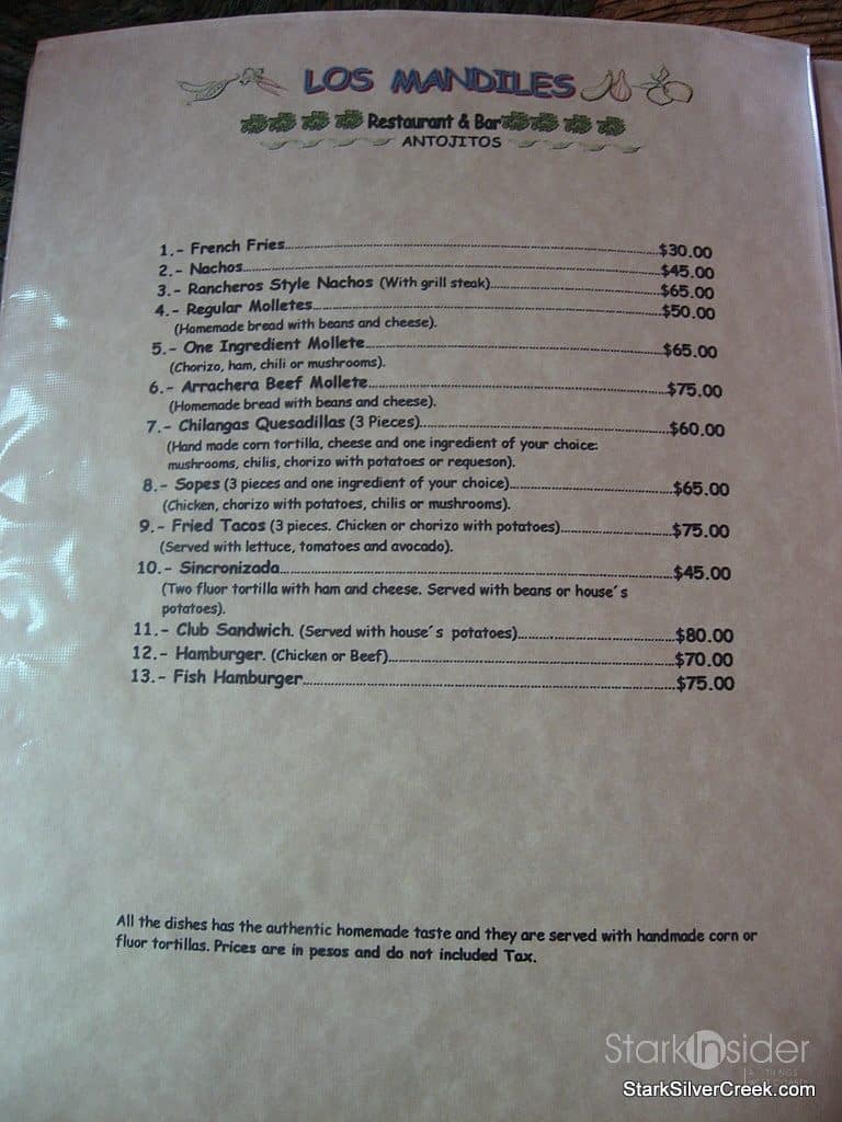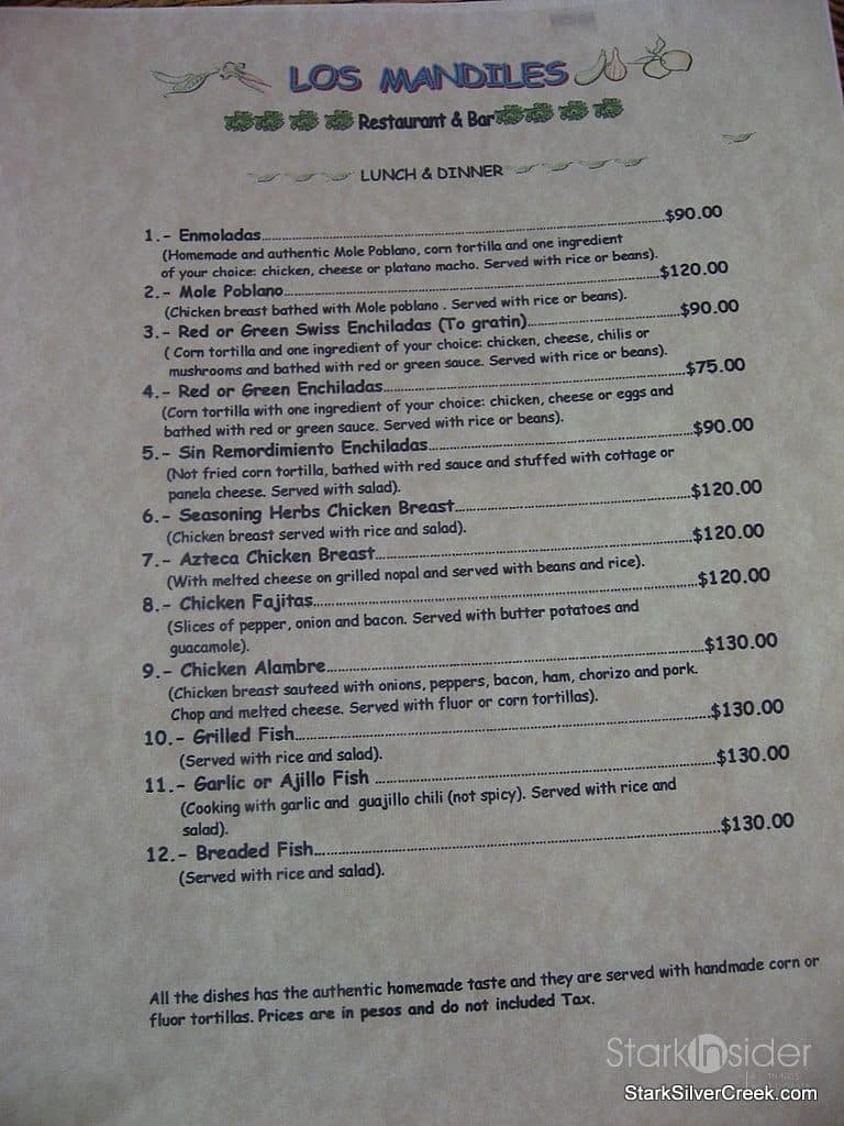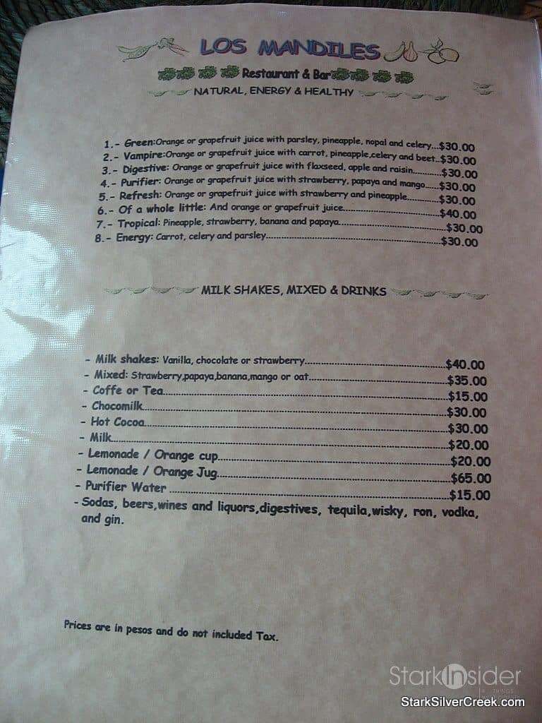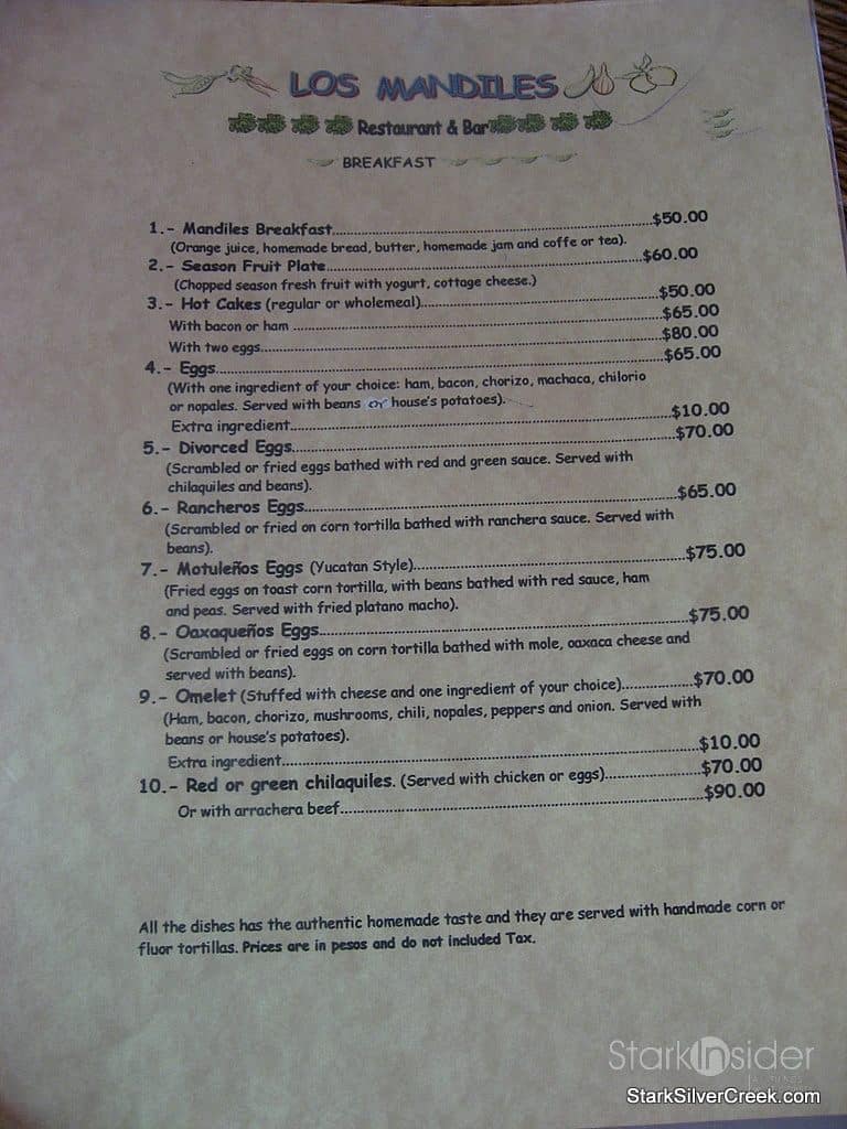 The owner came around to take our orders. Needing to make a quick decision, I decided to select what Marla always gets at Las Mandiles, Divorced Eggs (70 pesos:scrambled or fried eggs bathed in red and green sauce. served with chilaquiles and beans). I figured it was a pretty safe bet trusting in her many years of experience here in Loreto. I had to smile at the name ‘Divorced Eggs’ and when I twittered (@lonikaostark) that I had ordered this dish, I did get a quick reply asking me what they were.
