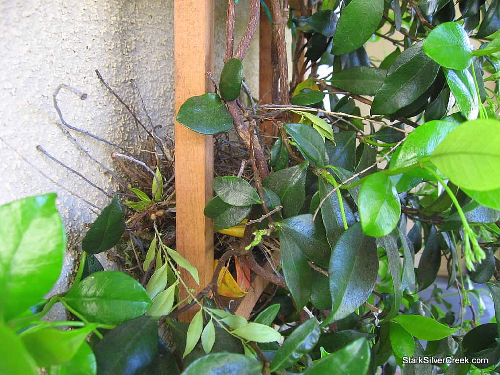 As I was looking at the star jasmine plant I have climbing up a trellis I had erected, I noticed some dry twigs mixed in with the vines. It took me a little while to realize it was a nest.