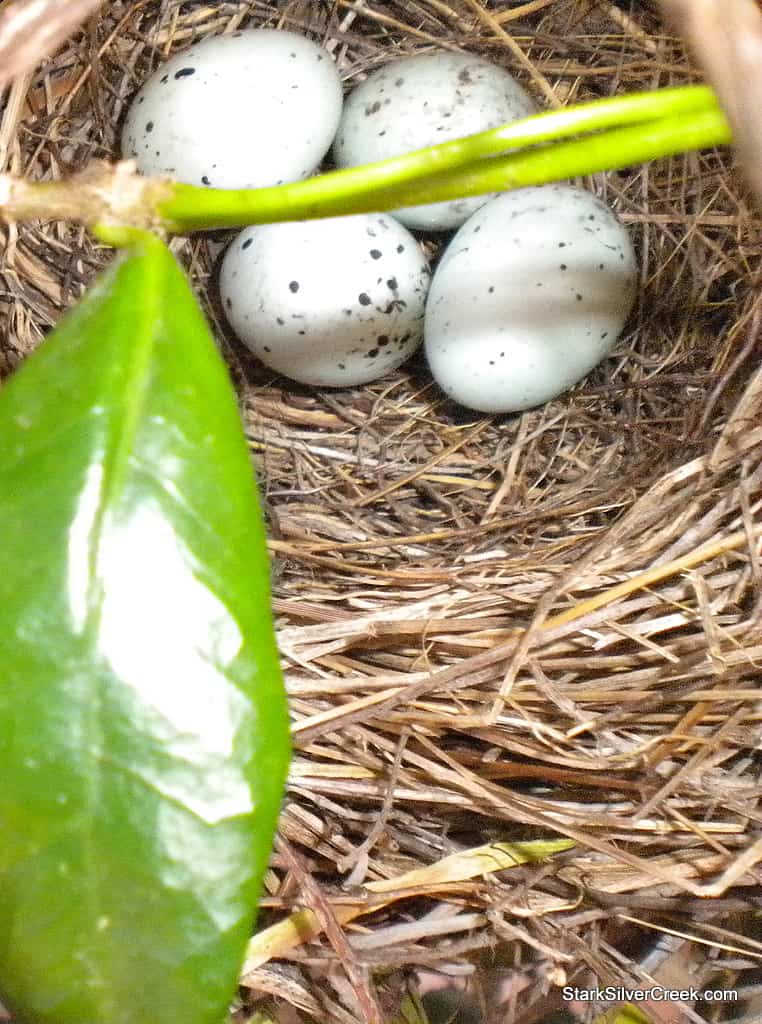 My height handicaps me from looking into the nest, sometimes I can catch a glimpse of the eggs if I stand on my tippy toes. I carefully reached over with one arm and took the photo. Much to my surprise, instead of three eggs being captured on the new shiny back screen of my camera, there were four.