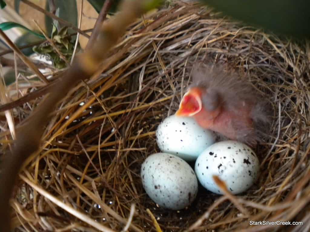 Expecting to see four eggs as I peered into the nest while the mother bird was away, I was completely surprised to see that only three eggs were present along with a tiny ball of fur. I then realized this little ball of fur was a baby bird. Later this evening, one of the other eggs cracked open and a sibling bird hatched.