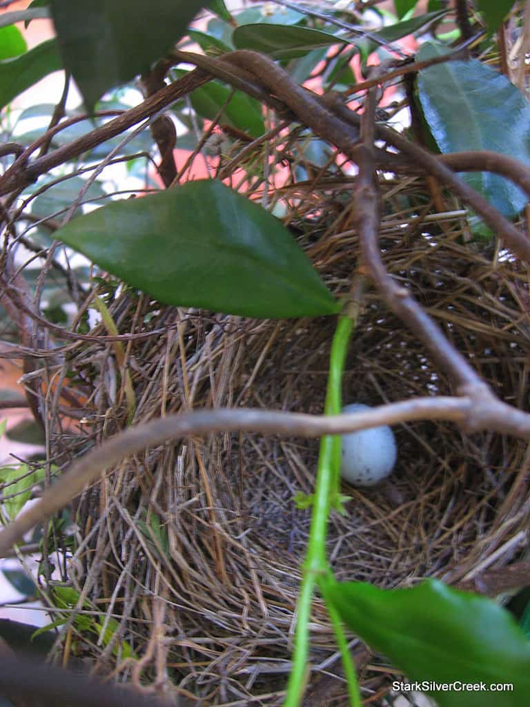 So today, with no coffee yet, 6:30 am call with India and Canada on my cordless, another hand on my blackberry checking email, and somehow in between, I balanced my digital camera. As someone on the conference call talked about the status of a project and I noticed the nest was birdless, I gently opened the french doors to the courtyard. Mission, to take a photo of the three eggs in the nest.