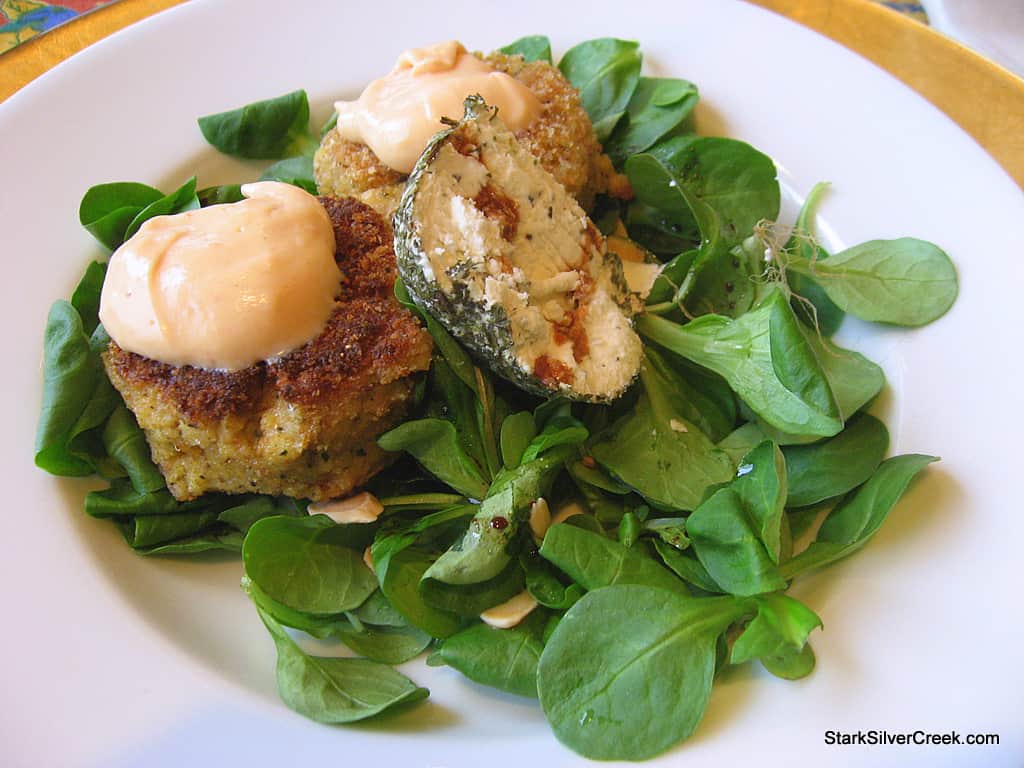 When the crab cakes are done, place them on top of the bed of greens and serve. And when you ask your guests if anyone wants any seconds of crab cakes, they will all shout, “Crabs ahoy, matey!”. Okay, maybe your guest have been trained just to say, “Yes, please”.