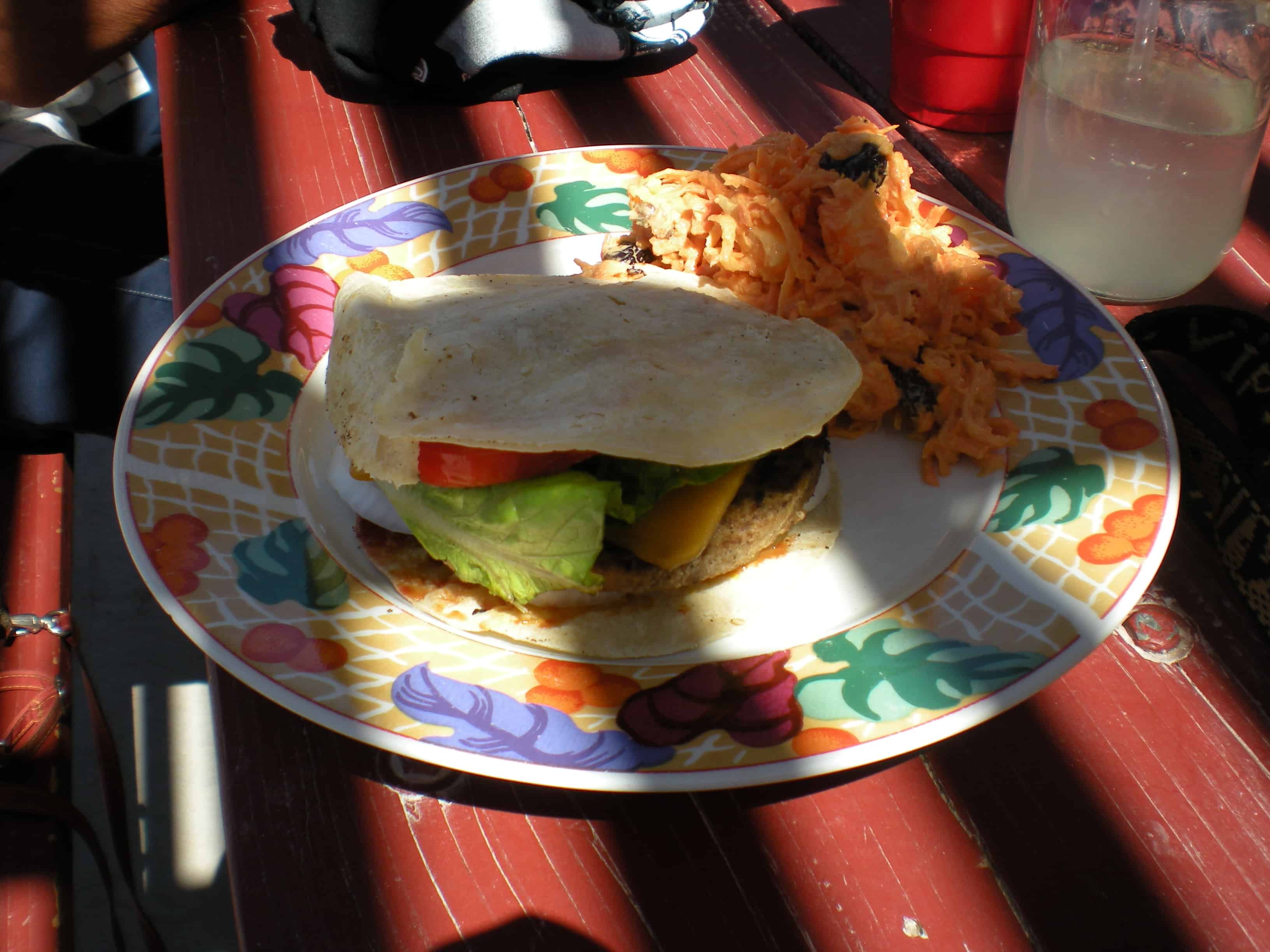 Anyway, back to the last day festivities. Mike and Cholie were in the kitchen grilling those burgers non-stop. Sharon and I ordered their delicious vegieburgers. And if that weren’t maverick enough on this Wapo day, I ordered mine with corn tortillas instead of a bun because I am allergic to wheat. It’s actually delicious with all the fixings on the tortillas, a little messy but delicious.